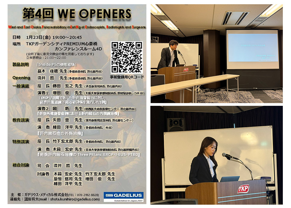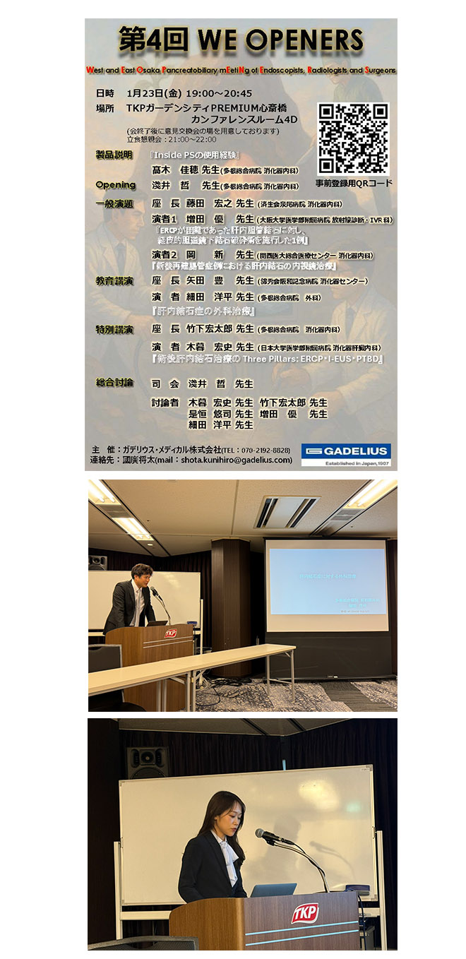 内視鏡センターからのお知らせ 第4回WE OPENERSにて細田医師、松原医師が講演しました 2026.01.25 1月23日 TKPガーデンシティPREMIUM心斎橋(大阪市中央区)にて『第4回 WE OPENERS』が開催され、当院の細田医師、松原医師が講演、竹下医師が司会を務めました イメージをタップ(クリック)していただけますと、PDFファイルをご覧いただけます。 前の記事: 淺井医師がGastroenterology Expert Seminar において講演を行いました